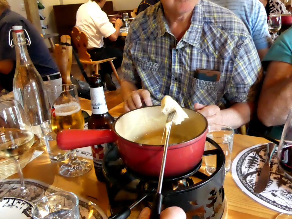 Nevertheless we joined the group on a train ride, high into the mountains to Chateau D’Oex in the Gruyure region. It was a brilliant journey and we stopped for lunch at the chateau where we saw cheese making and tasted it fondue style. This was followed by a ridiculously large main course and dessert.