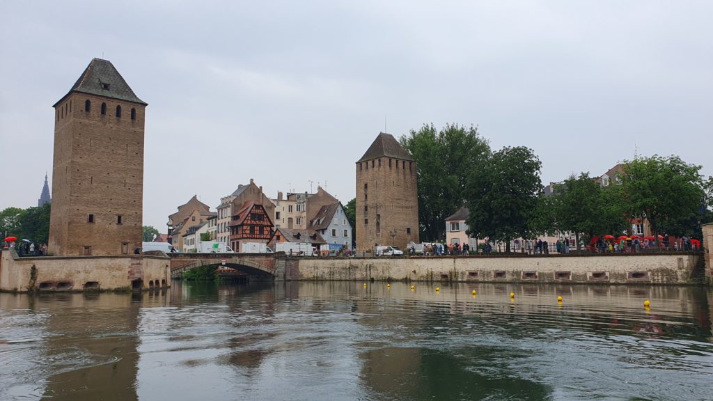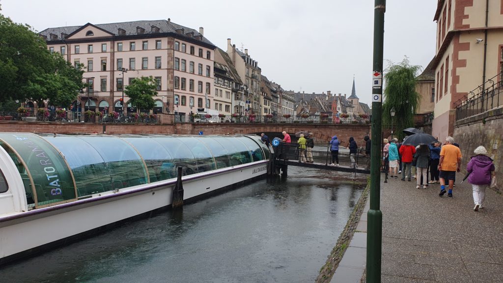 We arrived in Strasbourg sometime during the night and, after a quick breakfast, set off for a canal tour. The original Strasbourg is actually an island and the canal, including 2 locks, goes all of the way around it. Our great weather finally deserted us today and it was drizzling rain for about 2 hours including all of the time we were on the canal boat. Fortunately it was enclosed with a clear roof so we could see everything, though not as clearly as we would have liked. I managed to open up a section at the back and get some good shots. We learned that Strasbourg has alternated between French and German ownership several times over the centuries, including at least 3 times in the 1900’s. People had to change all of their names, addresses, etc each time this occurred – pretty bizarre.